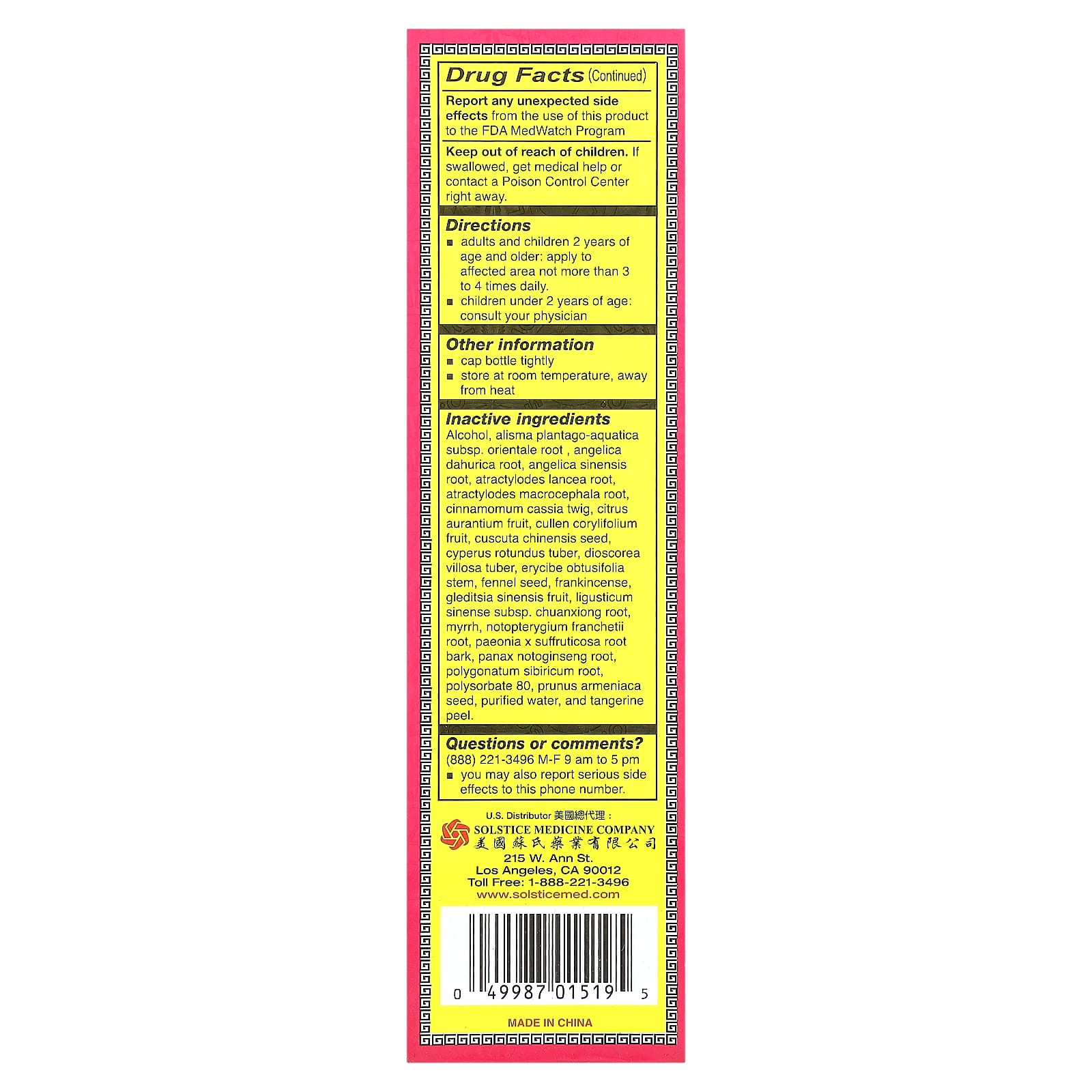 | спирт, Alisma plantago-aquatica подвид корень восточного дудника, корень дудника даурского (Angelica dahurica), корень дудника китайского (Angelica sinensis), корень атрактилодеса ланцетолистного (Atractylodes lancea), корень атрактилодеса макроцефала, ветки кассии (Cinnamomum cassia), плоды померанца (Citrus aurantium), плоды лещинолистной (Cullen corylifolium), семена дудника китайского (Cuscuta chinensis), клубень сычуаньского перца (Cyperus rotundus), клубень диоскореи волосистой (Dioscorea villosa), стебель эрисиба туполистного (Erycibe obtusifolia), семена фенхеля, ладан, плоды гледичии (Gleditsia sinensis), бирючину (Ligusticum sinense подвид. корень чуаньского перца (Chuanxiong), мирра, корень Notopterygium frenchetii, кора корня пиона (Paeonia x suffruticosa), корень женьшеня обыкновенного (Panax notoginseng), корень рейнутрии сибирской (Polygonatum sibiricum), полисорбат 80, семена сливы (Prunus armeniaca), очищенная вода и цедра мандарина. | |