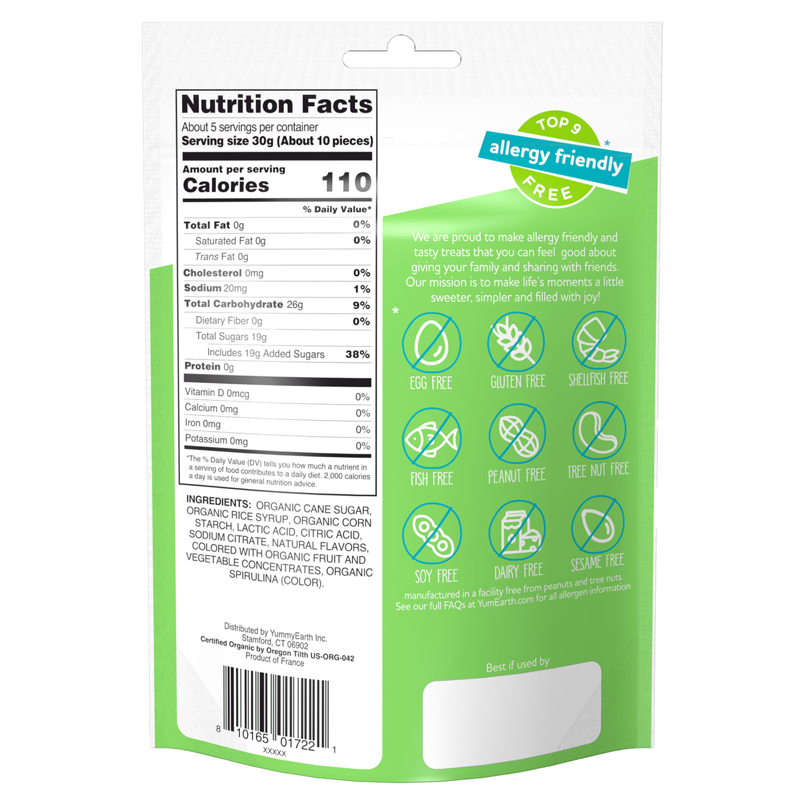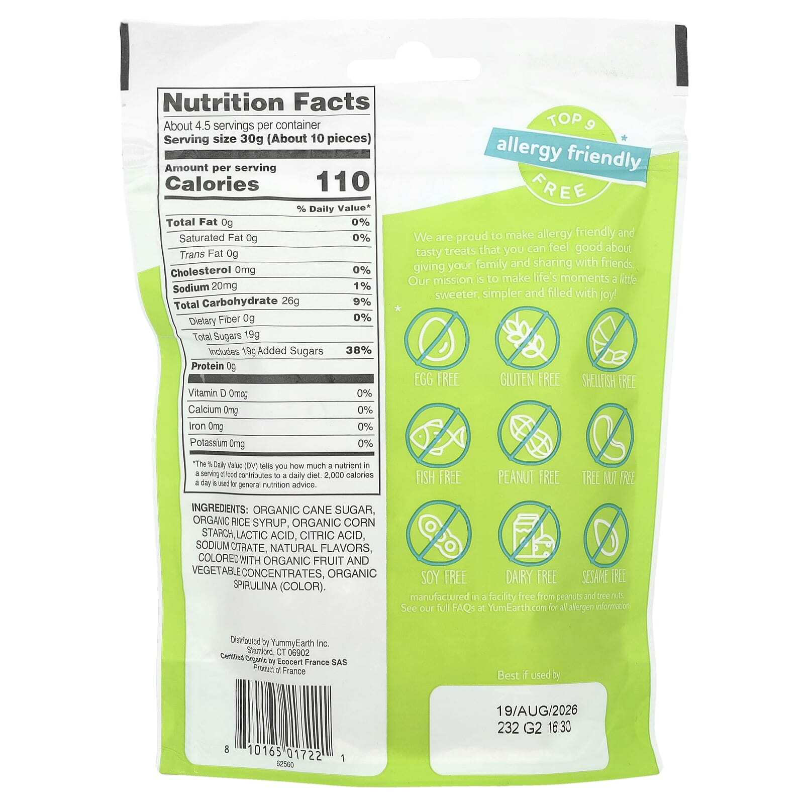 Органический тростниковый сахар, органический рисовый сироп, органический кукурузный крахмал, молочная кислота, лимонная кислота, цитрат натрия, натуральные ароматизаторы, красители из органических фруктовых и овощных концентратов, органическая спирулина (краситель).