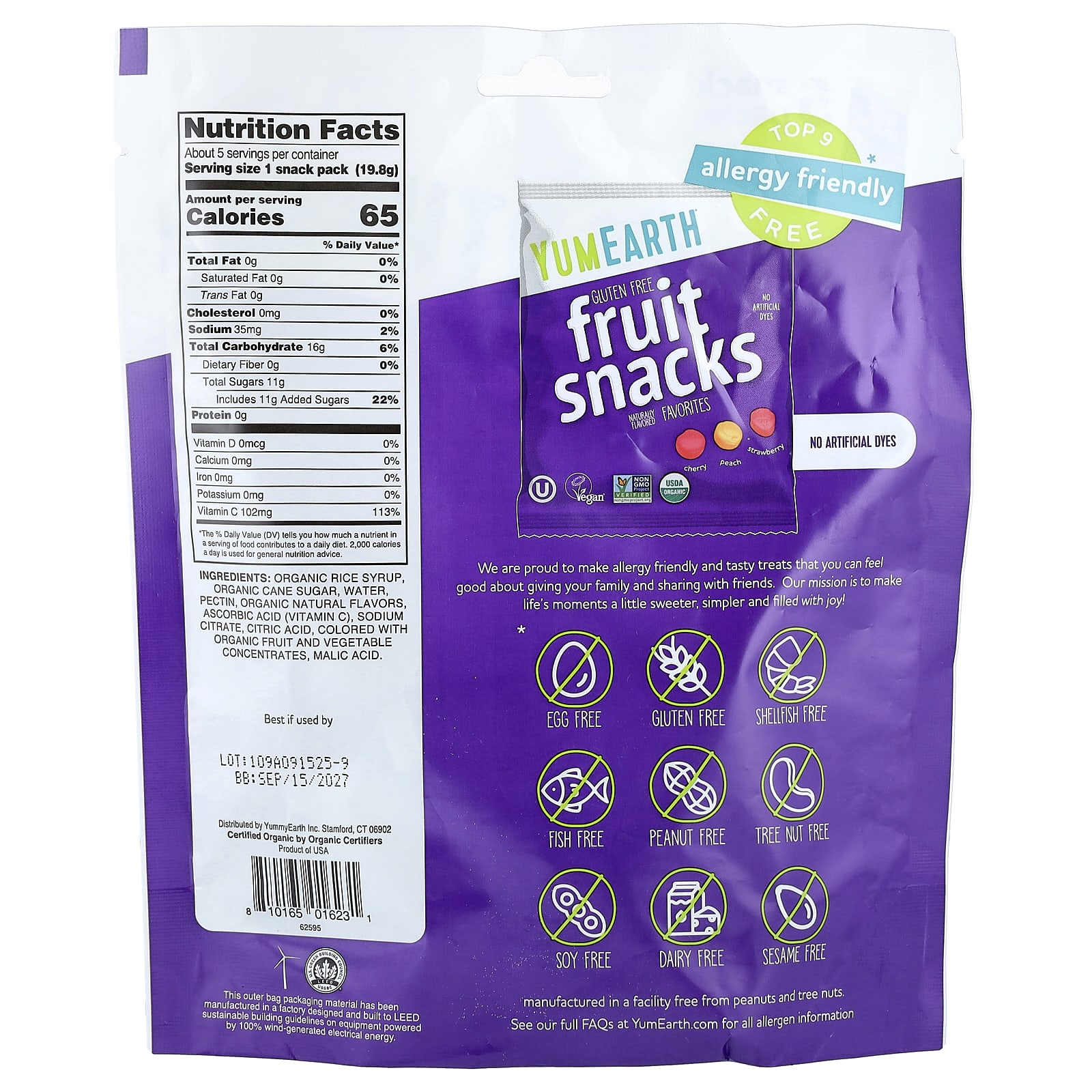 Органический рисовый сироп, органический тростниковый сахар, Вода, пектин, органические натуральные ароматизаторы, аскорбиновая кислота (витамин C), цитрат натрия, лимонная кислота, в качестве красителей используются концентраты органических фруктов и овощей, яблочная кислота.