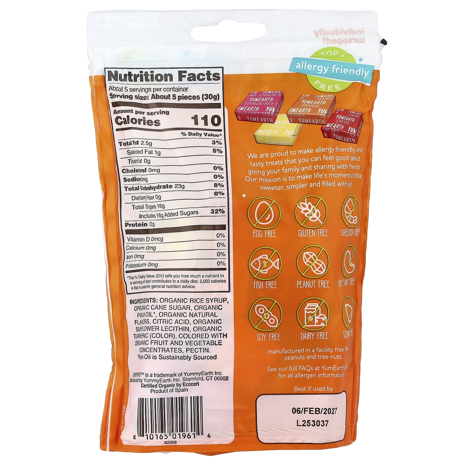Органический рисовый сироп, органический тростниковый сахар, органическое пальмовое масло*, органические натуральные ароматизаторы, лимонная кислота, органический подсолнечный лецитин, органическая куркума (краситель), в качестве красителей используются концентраты органических фруктов и овощей, пектина.