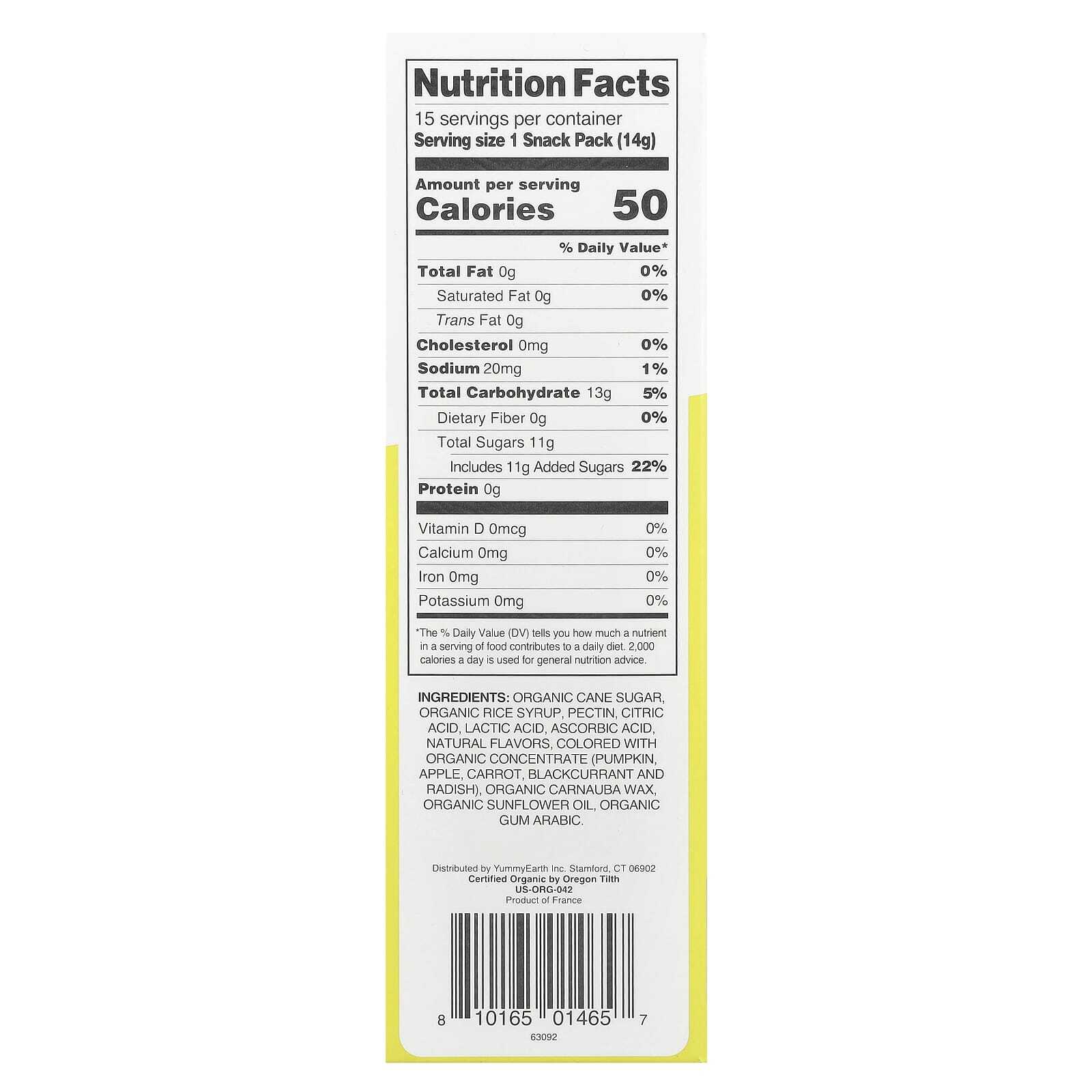 Органический тростниковый сахар, органический рисовый сироп, пектин, лимонная кислота, молочная кислота, аскорбиновая кислота, натуральные ароматизаторы, красители из органического концентрата (тыква, яблоко, морковь, черная смородина и редька), органический карнаубский воск, органическое подсолнечное масло, органическая аравийская камедь.