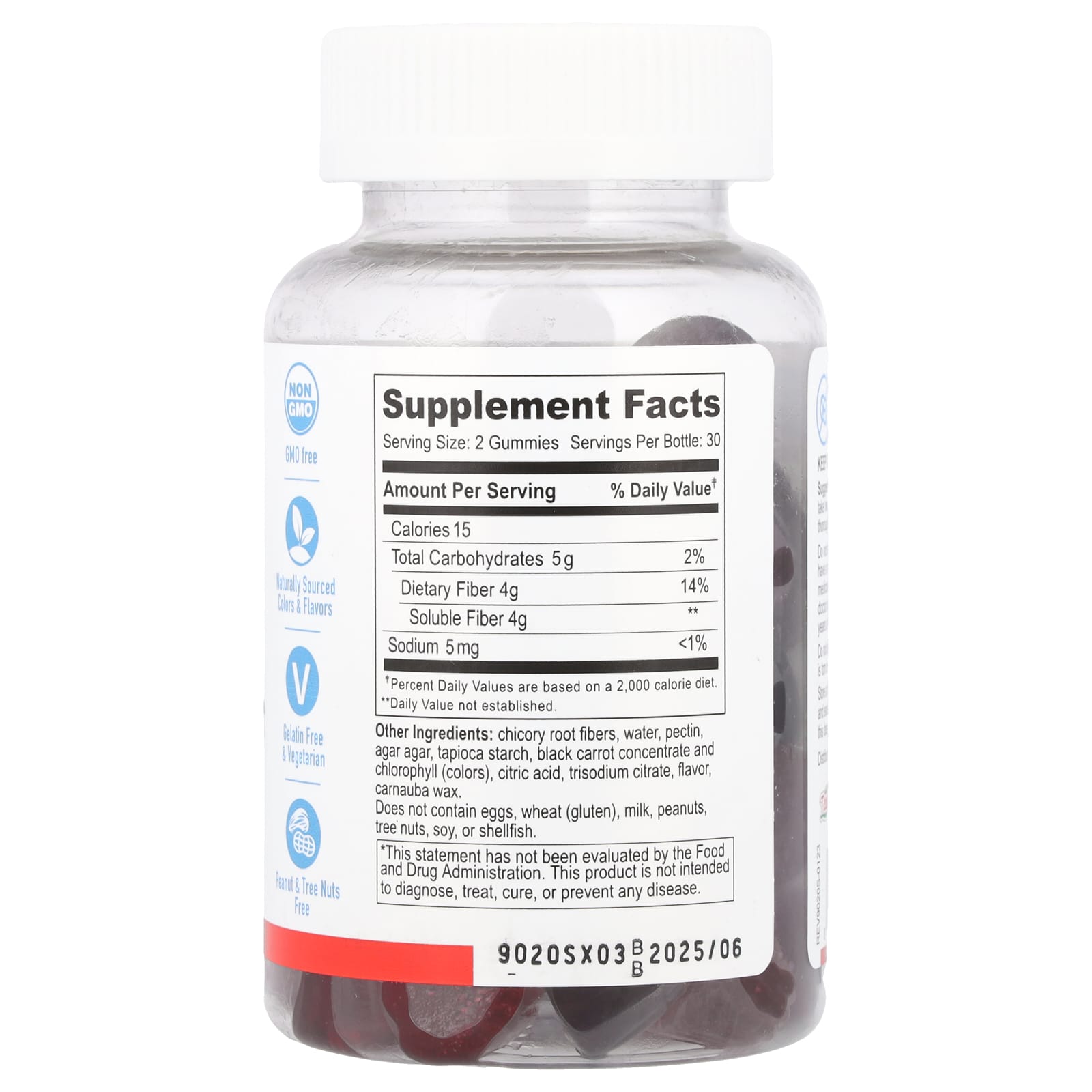 Волокна корня цикория, вода, пектин, агар-агар, тапиоковый крахмал, концентрат черной моркови и хлорофилл (красители), лимонная кислота, тринатриевый цитрат, ароматизатор, камаубский воск.
