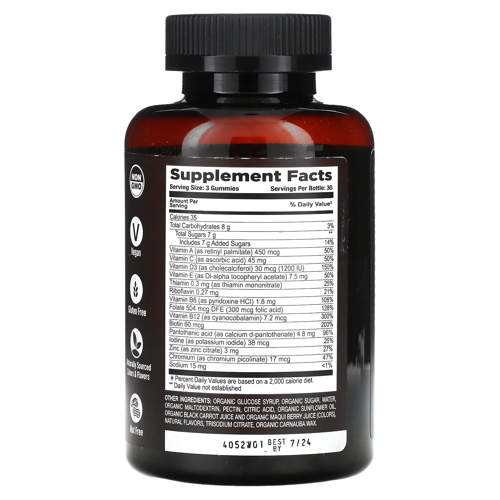 Органическая крахмальная патока, органический сахар, вода, органический мальтодекстрин, пектин, лимонная кислота, органическое подсолнечное масло, органический сок черной моркови и органический сок ягод маки (красители), натуральные ароматизаторы, тринатриевый цитрат, органический карнаубский воск.