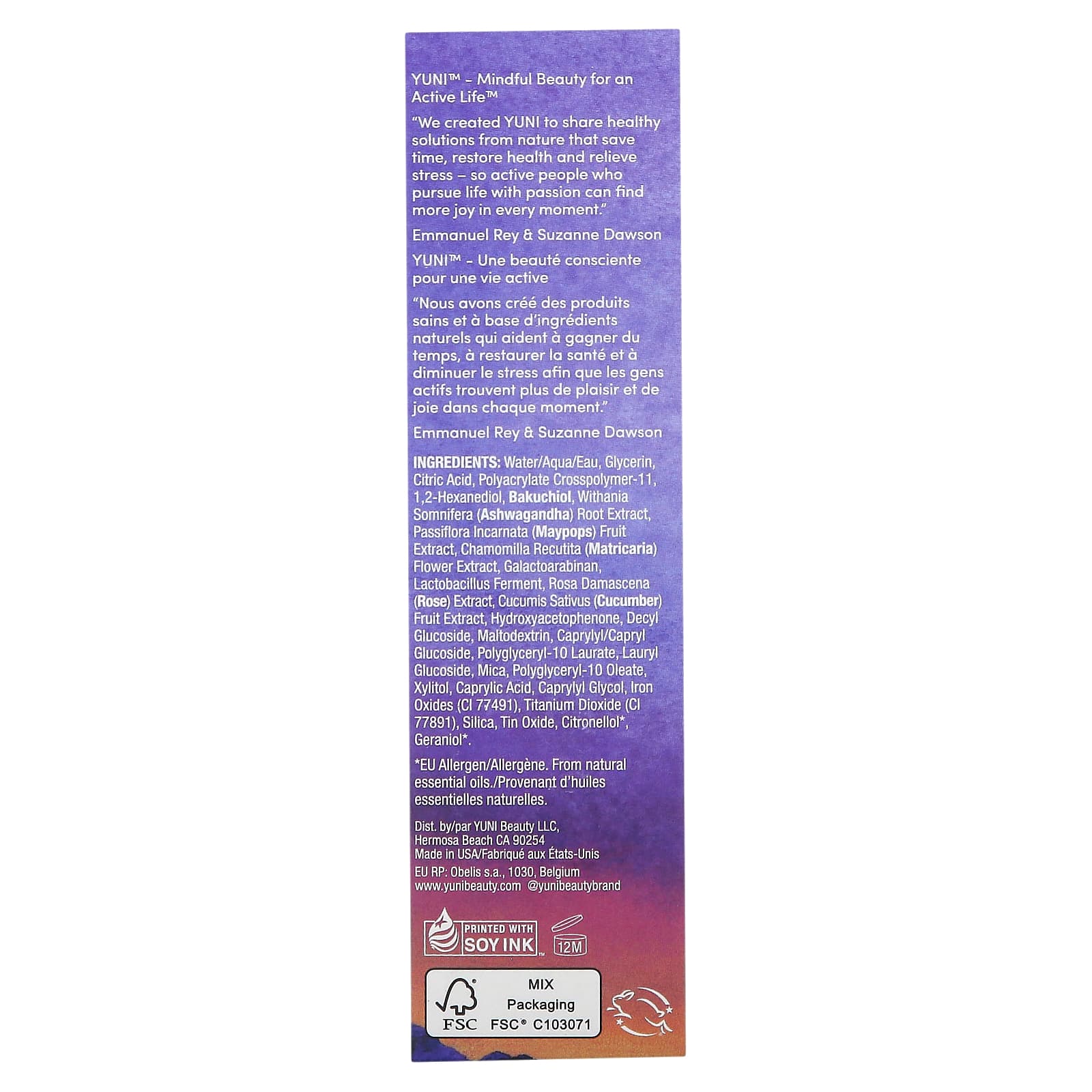 Вода, глицерин, лимонная кислота, полиакрилата кроссполимер-11,1,2-гександиол, бакучиол, экстракт корня ашваганды (Withania somnifera), экстракт плодов пассифлоры (Passiflora incarnata), экстракт цветков ромашки лекарственной (Chamomilla recutita), арабиногалактан, фермент лактобактерий (Lactobacillus), экстракт дамасской розы (Rosa damascena), экстракт плодов огурца (Cucumis sativus), гидроксиацетофенон, децил глюкозид, мальтодекстрин, каприлил/каприл глюкозид, полиглицерил-10 лаурат, лаурил глюкозид, слюда, полиглицерил-10-олеат, ксилитол, каприловой кислоты, каприлилгликоль, оксиды железа (CI 77491), диоксид титана (CI 77891), диоксид кремния, оксид олова, цитронеллол*, гераниол*.