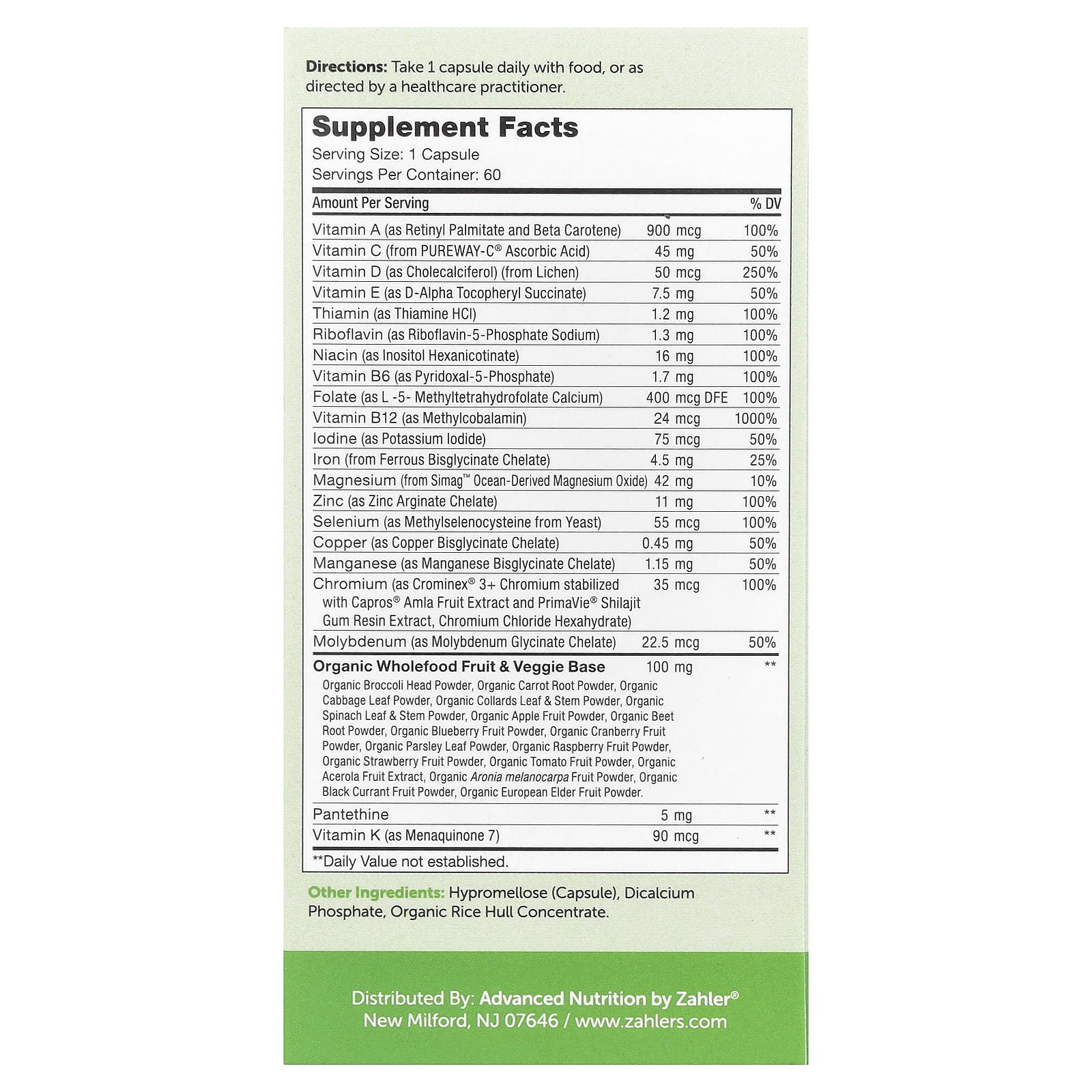 Содержит 20 незаменимых витаминов и минералов в одной капсуле для приема в день. Эта комплексная комбинация обеспечивает питательные вещества, необходимые для восполнения пробелов в ежедневном питании.