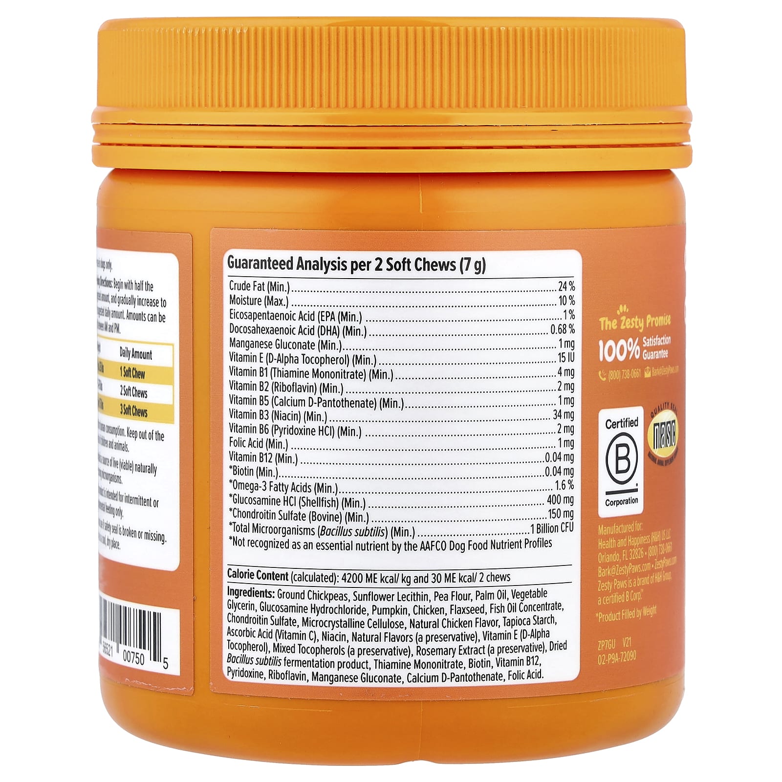 ​Молотый нут, подсолнечный лецитин, гороховая мука, пальмовое масло, растительный глицерин, глюкозамина гидрохлорид, тыква, курица, льняное семя, концентрат рыбьего жира, хондроитин сульфат, микрокристаллическая целлюлоза, натуральный ароматизатор «Курица», тапиоковый крахмал, аскорбиновая кислота (витамин C), ниацин, натуральные ароматизаторы (консерванты), витамин E (d-альфа токоферол), смешанные токоферолы (консервант), экстракт розмарина (консервант), сухой продукт ферментации сенной палочки (Bacillus subtilis), тиамина мононитрат, биотин, витамин B12, пиридоксин, рибофлавин, глюконат марганца, d-пантотенат кальция, фолиевую кислоту.