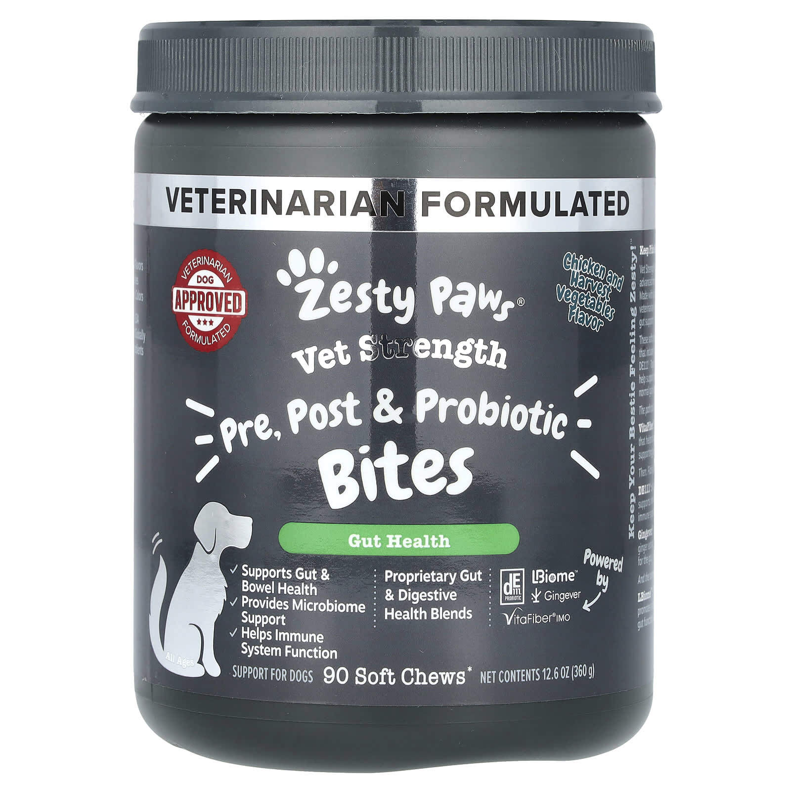 Vet Strength Pre, Post & Probiotic Bites — это самая усовершенствованная формула в нашей линейке добавок для здоровья кишечника. Эти жевательные таблетки, разработанные ветеринарами, имеют восхитительный вкус, одобренный Fido, и обеспечивают полноценную поддержку пищеварения и кишечника.