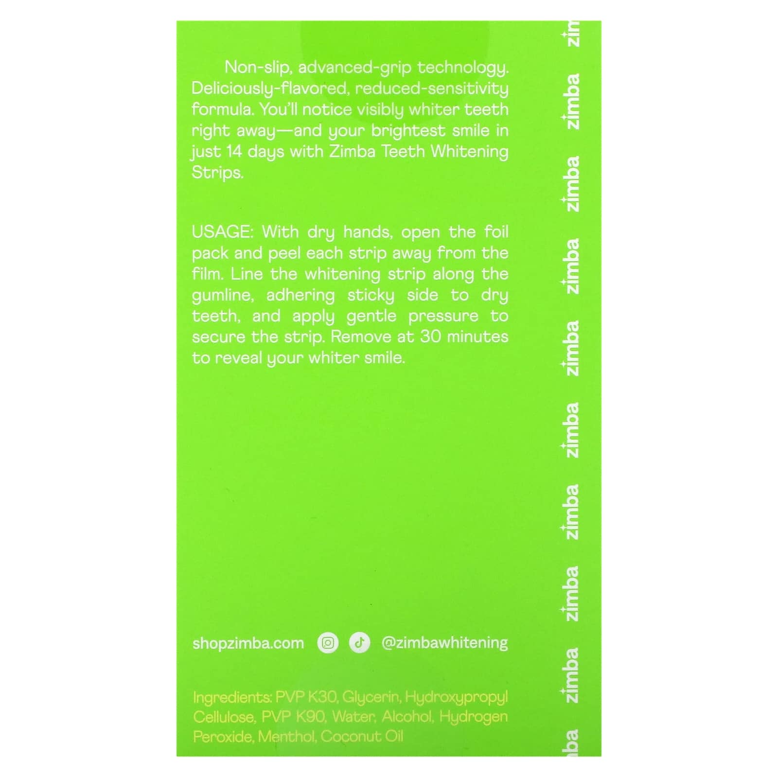 Улучшенная технология предотвращения скольжения. Формула с восхитительным вкусом, снижающая чувствительность. Вы сразу заметите заметно более белые зубы и самую сияющую улыбку всего за 14 дней благодаря полоскам для отбеливания зубов Zimba.