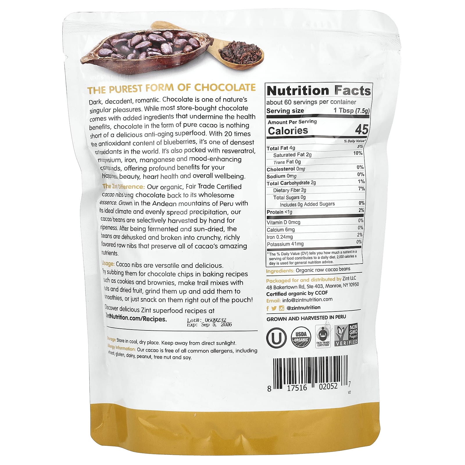 Отличия Zint: Наши органические какао-крупки, сертифицированные Fair Trade, возвращают шоколаду его полезную сущность. Наши какао-бобы, выращенные в Андских горах Перу с идеальным климатом и равномерно распределенными осадками, собираются вручную для созревания. После ферментации и сушки на солнце бобы дезинфицируются, очищаются от шелухи и превращаются в хрустящие сырые зерна с богатым вкусом, в которых сохраняются все удивительные питательные вещества какао.