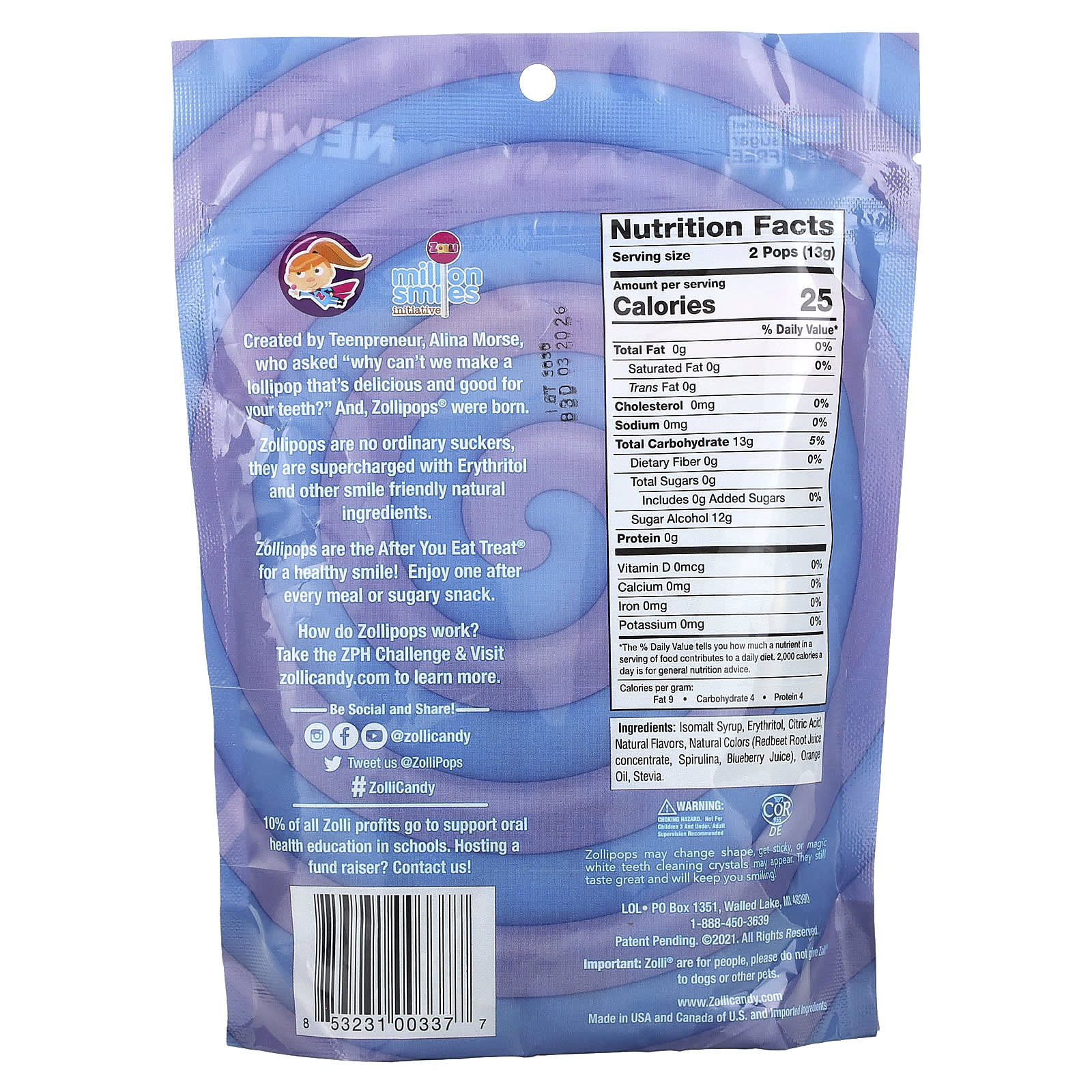 Создано юным предпринимателем Алиной Морс, которая задалась вопросом: «Почему мы не можем сделать вкусную конфету, полезную для зубов?» Так появились леденцы Zollipops®.