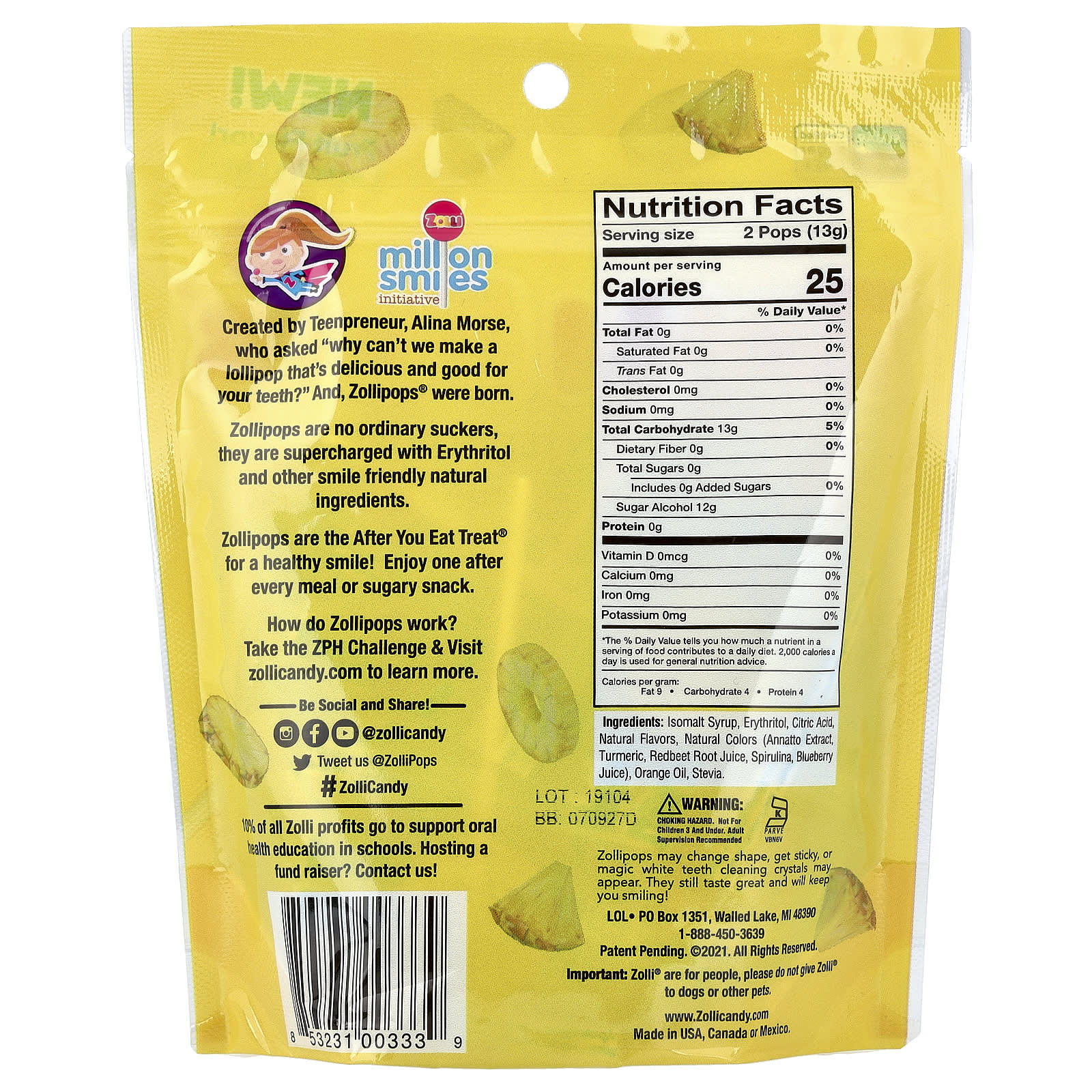Создано юным предпринимателем Алиной Морс, которая задалась вопросом: «Почему мы не можем сделать вкусную конфету, полезную для зубов?» Так появились леденцы Zollipops®.