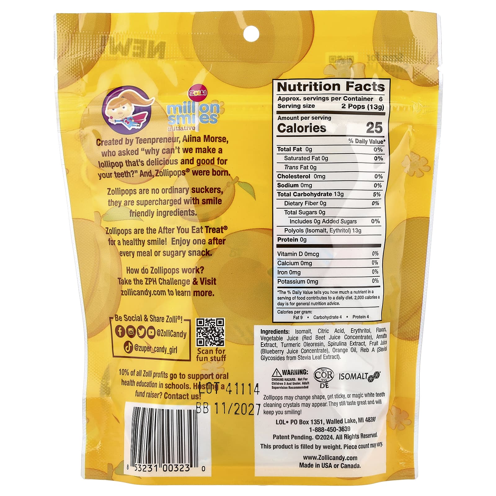 Создано юным предпринимателем Алиной Морс, которая задалась вопросом: «Почему мы не можем сделать вкусную конфету, полезную для зубов?» Так появились леденцы Zollipops®.
